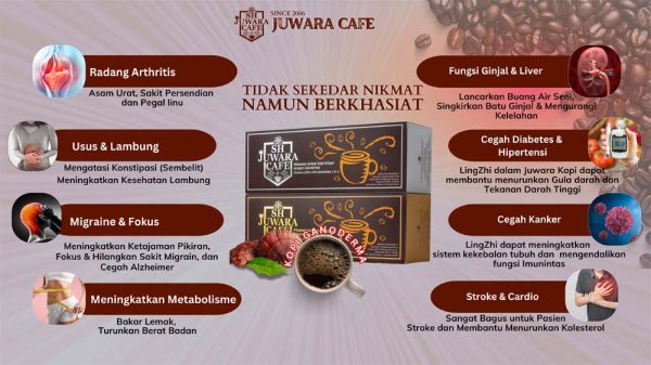 Penjelasan: Alih Belanja dari kopi sachet biasa yang mengandung Lemak Trans, ke Kopi Juwara (Kopi Arabika + Yung Kien Ganoderma). Kopi Juwara adalah kopi kesehatan terbaik yang bermanfaat untuk menjaga imunitas dan anti-aging.