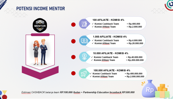 Mari kita lihat bagaimana potensi income di level Influencer dapat melesat, berkat persentase cashback team 20% dan komisi afiliasi hingga 3 generasi.